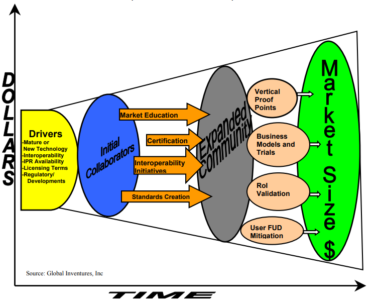 It should be noted that this community approach provides some guarantee of traction from the outset, because both early and future participants are aligned with the need for a new or replacement standard as a requirement for market development. So, the initiative is not about altruism or ‘doing the right thing’ per se. It is all about enabling the largest possible market as quickly as possible- and most importantly, about hedging risk. Our experience suggests that a given standard requires a minimum of $3 million in funding over a multi-year period to create the standard, launch interoperability and certification programs, educate and reach users, and mitigate the Fear, Uncertainty, and Doubt users typically have with trialing and deploying new technology. Few companies are willing to place that size of bet by themselves. A community of 50-100 companies, where each contributes an equal or higher share of the total funding required, allows for financial investment to be managed down to the $30-50K level per company, and the upside in guaranteed traction and total available market provides for a strong risk/reward ratio.