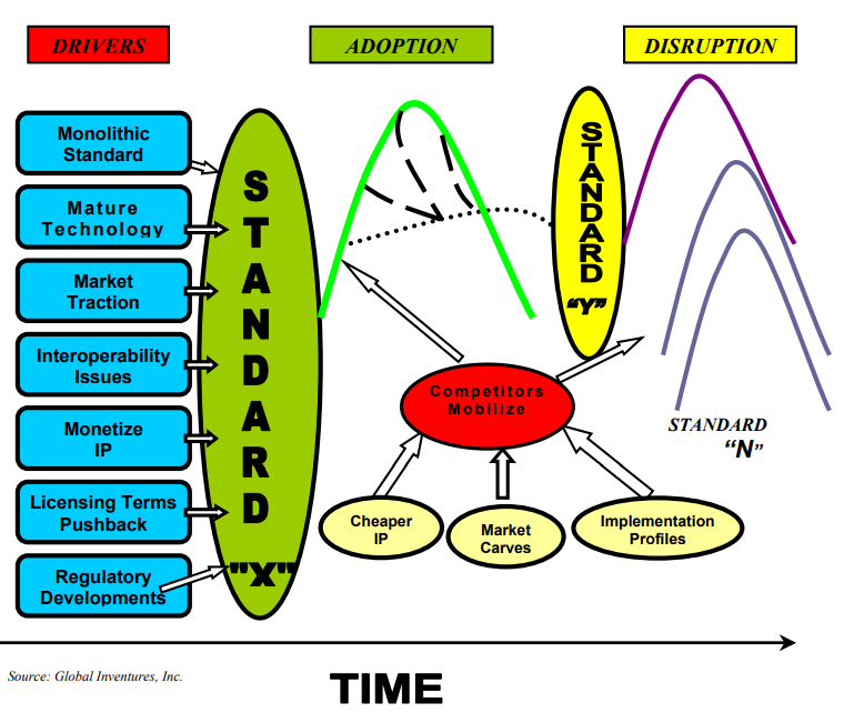 Whatever the driver, competitors to an approved standard mobilize early in the market cycle and commercial adoption curve. Their efforts can be: